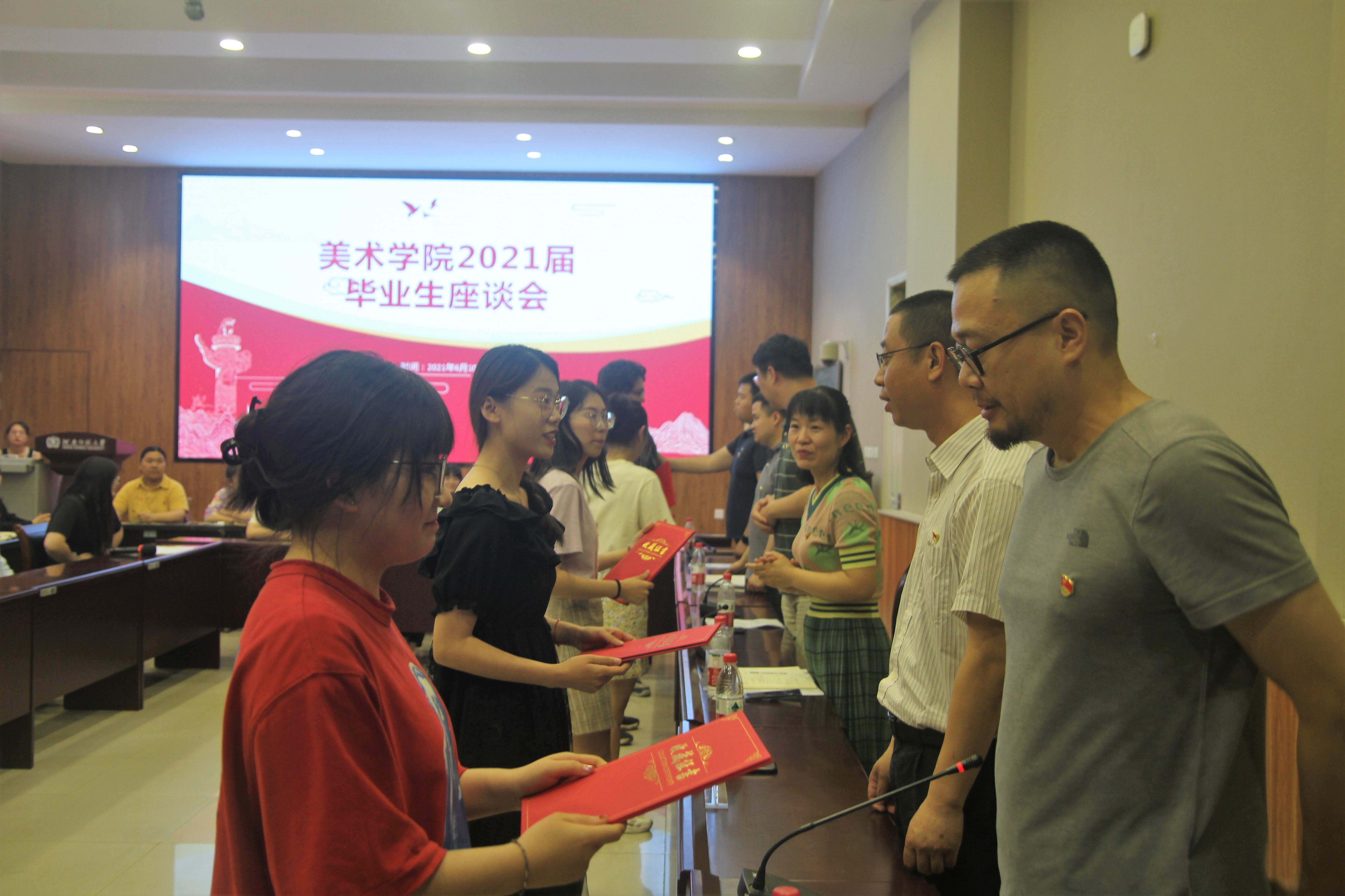 座谈会首先播放了美术学院2021届毕业生毕业纪念视频。随后,陈巍院长对毕业生们表达了感谢、祝福和期望,他希望大家永葆学习热情,常怀感恩之心,面对人生路上的困难要有锲而不舍的精神,为祖国的建设发展做出贡献。毕业年级辅导员徐宪在发言中表达了自己的不舍和期许,嘱咐学生要自信乐观,坚守初衷,心怀求知、感恩、拼搏之心。毕业生代表苏琦分享了四年来的收获与感悟,表达了自己的对学院老师的感激与不舍,祝福学院的明天更加美好。