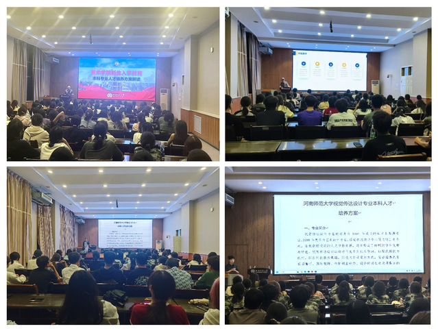 9月19日晚上,王霄首先为同学们详细介绍了学院2022版本科人才培养方案的修订的背景与重点,分别从培养目标、毕业要求、课程设置等方面详细解读了美术学专业人才培养方案,指出同学们要尽早树立美术教师职业认同感,养成教育情怀。随后,相关专业负责人分为三个专场,分别为同学们深入解读了绘画、视觉传达设计、环境设计专业本科人才培养方案。在答疑环节中,同学们针对自身对专业方向,以及未来大学四年学习中可能会遇到的问题进行提问,各位老师耐心为同学们进行了解答。