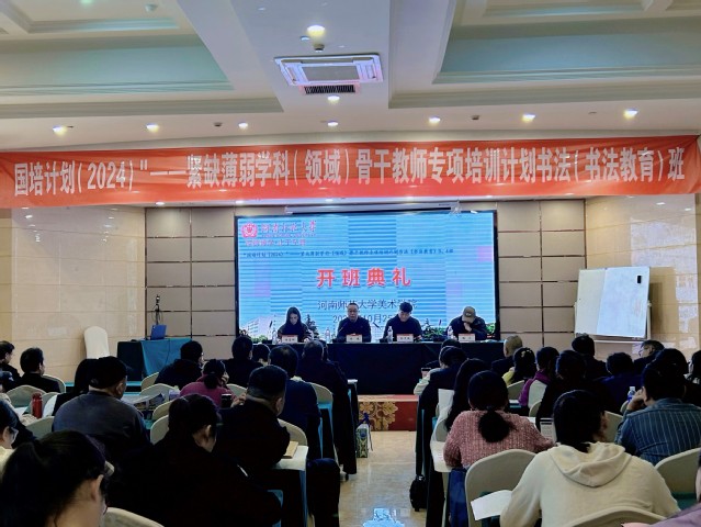 10月25日下午,国培计划(2024)——紧缺薄弱学科(领域)骨干教师培训书法(书法教育)班开班典礼在金玉满堂国际酒店五楼会议厅隆重举行。美术学院院长陈巍、副院长张笑乾,学科班主任路文、王意娜,生活班主任李胜利、张靖,以及来自南阳、濮阳的100位培训学员参加了本次开班典礼,仪式由美术学院副院长张笑乾主持。