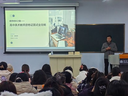 12月3日,美术学院邀请到新乡市正高级教师赵俊岭老师,为2022级美术学专业本科生作题为“教师成长之路——高中美术教师资格证面试全攻略”的专题讲座,讲座由2022级美术学专业班主任马燃主持。