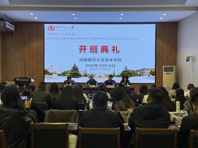 10月10日上午,2025年河南省义务教育师资薄弱环节改善暨中小学教师素质提升工程省级骨干教师培育初中美术班开班典礼在美术学院三楼多媒体教室隆重举行。美术学院院长陈巍、副院长张笑乾、社会服务工作秘书陈雷、学科班主任马燃、生活班主任李胜利,以及来自全省各地区的40位培训学员参加了本次开班典礼,本次开班仪式由副院长张笑乾主持。