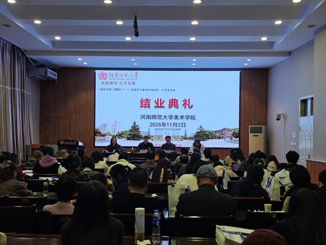 2025 年11月1日下午,由教育厅主办,河南师范大学美术学院承办的“国培计划(2025)”——农村骨干教师能力提升培训项目河南师范大学省级骨干教师培训初中/小学美术班顺利结束,结业仪式在河南师范大学美术学院多媒体报告厅举行。美术学院副院长张笑乾、社会服务工作秘书陈雷、学科班主任马燃、董明慧、生活班主任李胜利、张靖参加了本次结业典礼仪式,仪式由美术学院社会服务工作秘书陈雷主持。