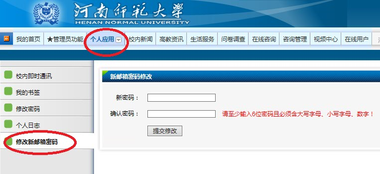 另外,也可在信息门户内来进行设置密码,此密码是单独访问新邮箱的密码http://mail.htu.edu.cn。方式如下图所示: