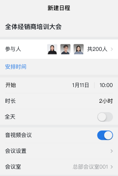 提供了高效组织会议和管理公共日历的能力,还可以邀请同事、微信客户、上下游一起参与日程