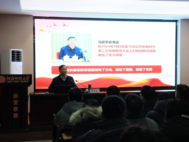 王玉良首先以习近平总书记在全国教育大会上的重要讲话引出大会召开的意义,强调要树立健康第一的教育理念。随后,他以“36855”“数”读全国教育大会精神,详细解析了教育相关的三大属性、六大特质、八大体系、五个重大关系及五项重大任务,带领大家全面理解把握全国教育大会的深刻内涵。他从列举大学生体质健康现状入手,围绕三个方面详细解析大学生体质健康的重要性,提出大学生体质健康已成为关乎中华民族伟大复兴的百年大计,强调青少年不仅要在学业上追求卓越,更要在体育锻炼中实现德智体美劳的全面发展。最后,王玉良结合我校体育事业发展、校园体育活动、体院学子的突出贡献等具体案例,对在座师生提出四点希望:一是培育校园体育文化,塑造健康的师大;二是厚植校园体育土壤,建设阳光的师大;三是探索全新驱动路径,打造创新的师大;四是弘扬中华体育精神,铸就奋进的师大。立足师大奋进新百年、争创双一流的新起点,他希望体院学子挺膺担当,不负时代重托,不辱学校使命,发挥体育专业优势,传播体育正能量,积极投身校园体育文化实践,为增进师大学子身心健康贡献智慧和力量,在新的人生坐标上书写出无愧时代的满意答卷!