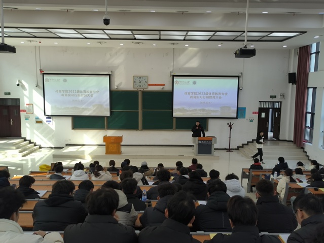 为保证学院本科生实习工作的顺利开展,落实我校相关部门对于实习工作的要求与细节,做好实习行前教育,2月17日上午,体育学院召开2022级体育教育专业本科生教育实习行前教育大会。体育学院副院长刘光同、体育学院实习带队教师和2022级体育教育专业学生参加了会议,会议由2022级辅导员安东主持。