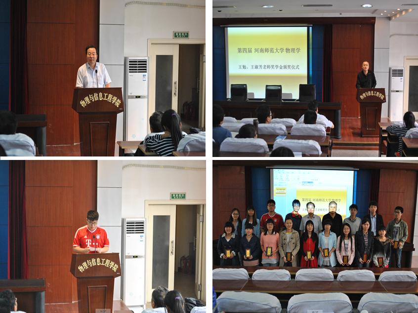 10月11日下午2:45,物理与电子工程学院在物理南楼二楼报告厅成功举办了第四届河南师范大学物理学王勉、王淑芳老师奖学金颁奖仪式。物理与电子工程学院院长杨宗献、党委副书记陈明银出席颁奖仪式,团委书记刘博担任主持。