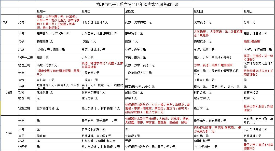 物理与电子工程学院2015年秋季第十一周考勤记录