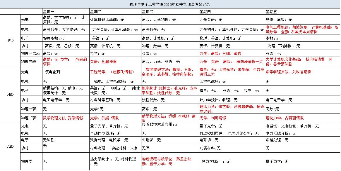 物理与电子工程学院2015年秋季第十五周考勤记录