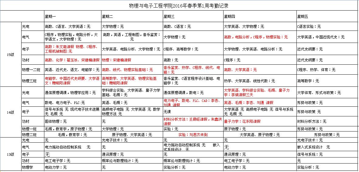 物理与电子工程学院2016年春季第一周考勤记录