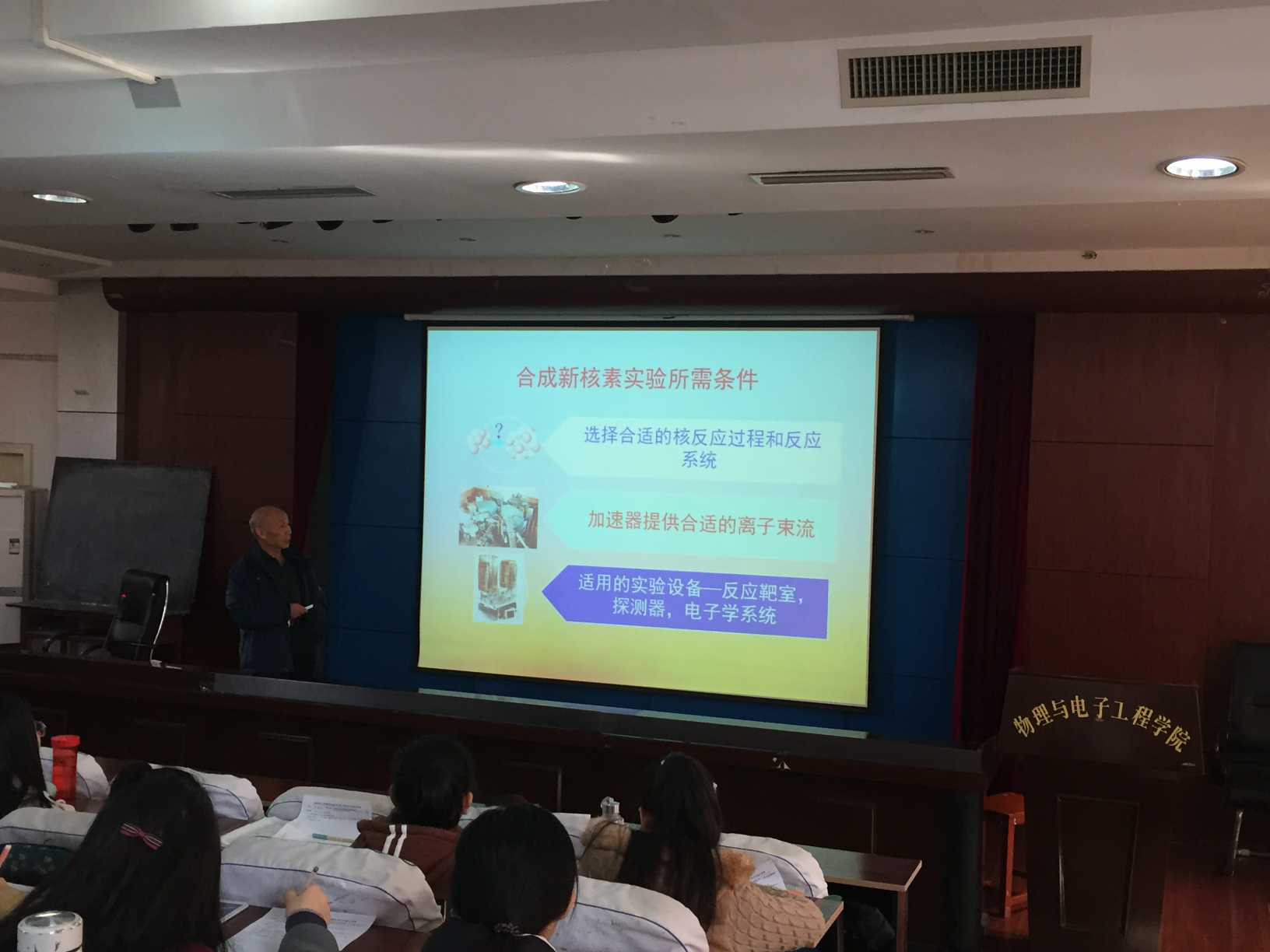 上午,靳根明教授作了题为“原子核从何而来?”的学术报告,首先对原子核的起源问题做了系统的讲解和阐述。原子核的产生是在宇宙大爆炸后很短的时间内,在宇宙碰撞冷却的过程中产生的,但质量轻的元素的产生和重元素的产生的机制是不同的,并详细介绍了合成新核素实验的所需条件、难点和我国的状况。报告结束后,他与在场师生就有关问题进行了讨论,并对提出的问题给予了耐心细致的回答和见解。
