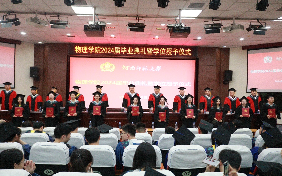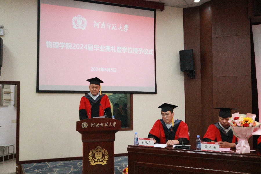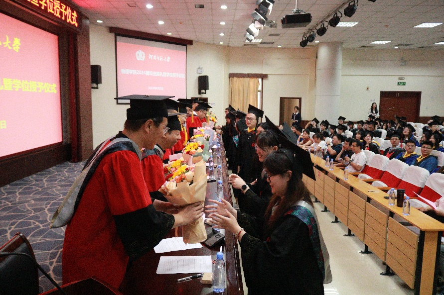 学院副院长焦照勇宣读了《河南师范大学关于授予物理学院2024届毕业生学位的决定》。在主席台就座的领导老师为2024届博士、硕士、本科毕业生逐一拨苏正冠并颁发毕业证书。毕业生代表向各位老师敬献鲜花,感恩学院四年来的教育和培养