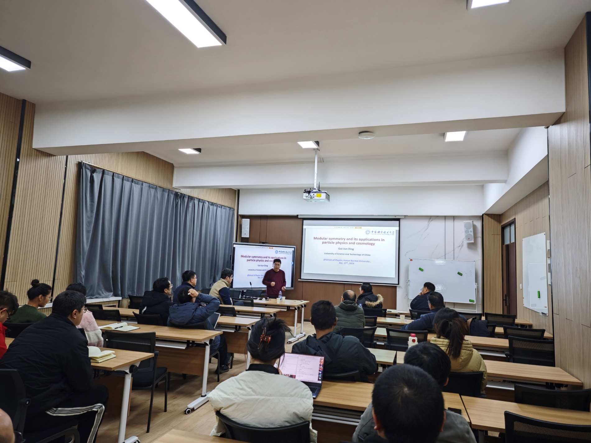 12月27日上午,中国科学技术大学丁桂军教授应邀为我校物理学院师生作题为“Modular symmetry and its applications in particle physics and cosmology”的学术报告,学院相关专业教师、研究生和本科生聆听此次报告。