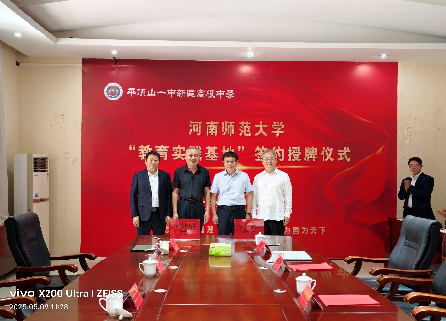 5月9日上午,河南师范大学与平顶山一中新区高级中学“教育实践基地”签约授牌仪式隆重举行。平顶山市教育体育局副局长尹卫东、河南师范大学物理学院党委书记陈明银、平顶山一中新区高级中学集团董事长关朝辉等领导共同见证这一重要时刻。