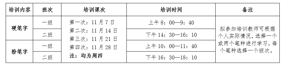 根据前期调研,本批次培训开设硬笔字和粉笔字,分别开设两个班,每个班均为四次课,培训班次、课次、时间等见下表,拟参加人员可根据个人空余时间等实际情况进行报名。