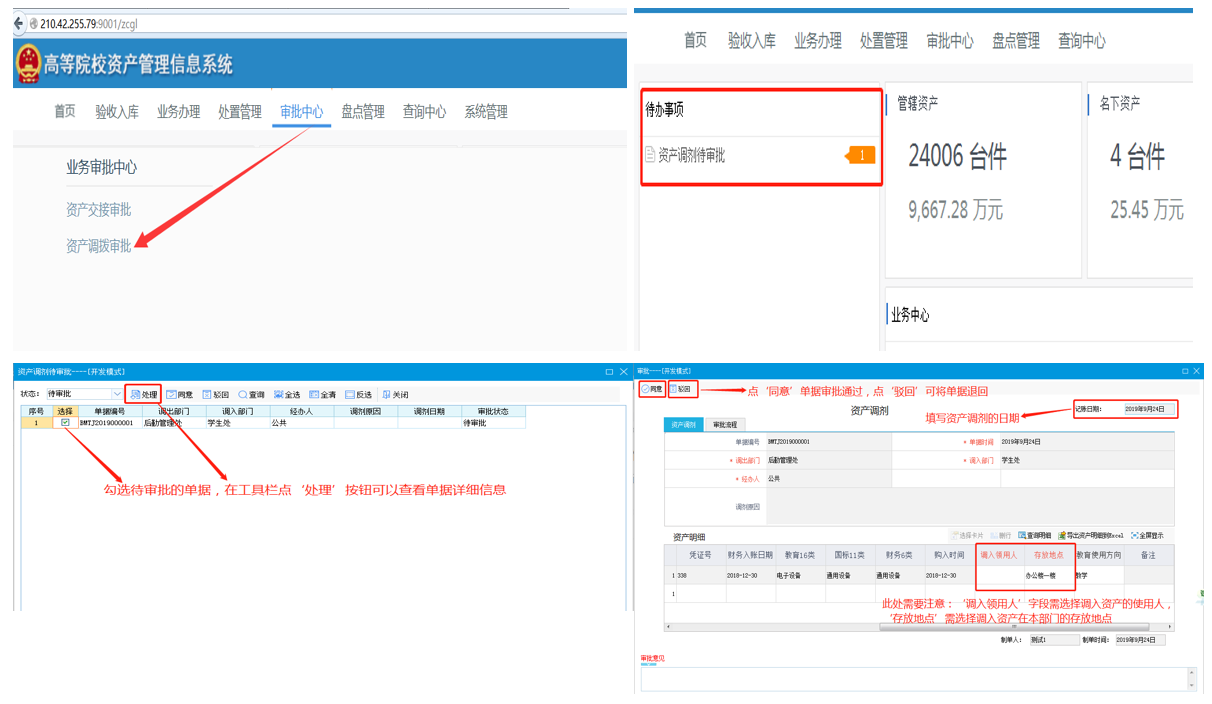 登录【办事大厅】--点击应用系统【高等院校资产管理系统】--点击首页【审批中心】—【资产调拨审批】(或点击首页【待办事项】--点击提醒信息即可打开待审批的单据)--勾选待审批的单据--打开工具栏【处理】—填写待审批单据的【调入领用人】和【存放地点】(必填,否则审核不通过)—最后点击【同意/驳回】(通过审批状态或流程监控查可看工作流状态。)
