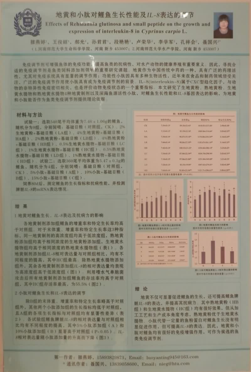 闭幕式上,受大会组委会委托,聂国兴教授及其它4位专家对本届世华会参与展示的348份墙报进行了精彩点评。大会共评出20份优秀墙报,我院2011级研究生雒燕婷同学的墙报“地黄和小肽对鲤鱼生长性能及IL-8表达的调节”被评为本届世华会优秀墙报。本次世华会集中展示了当今全球鱼虾营养与饲料领域的重要科研成果,为进一步加快水产饲料技术进步、加强产学研紧密结合、促进水产饲料产业的持续健康发展做出了积极贡献。
