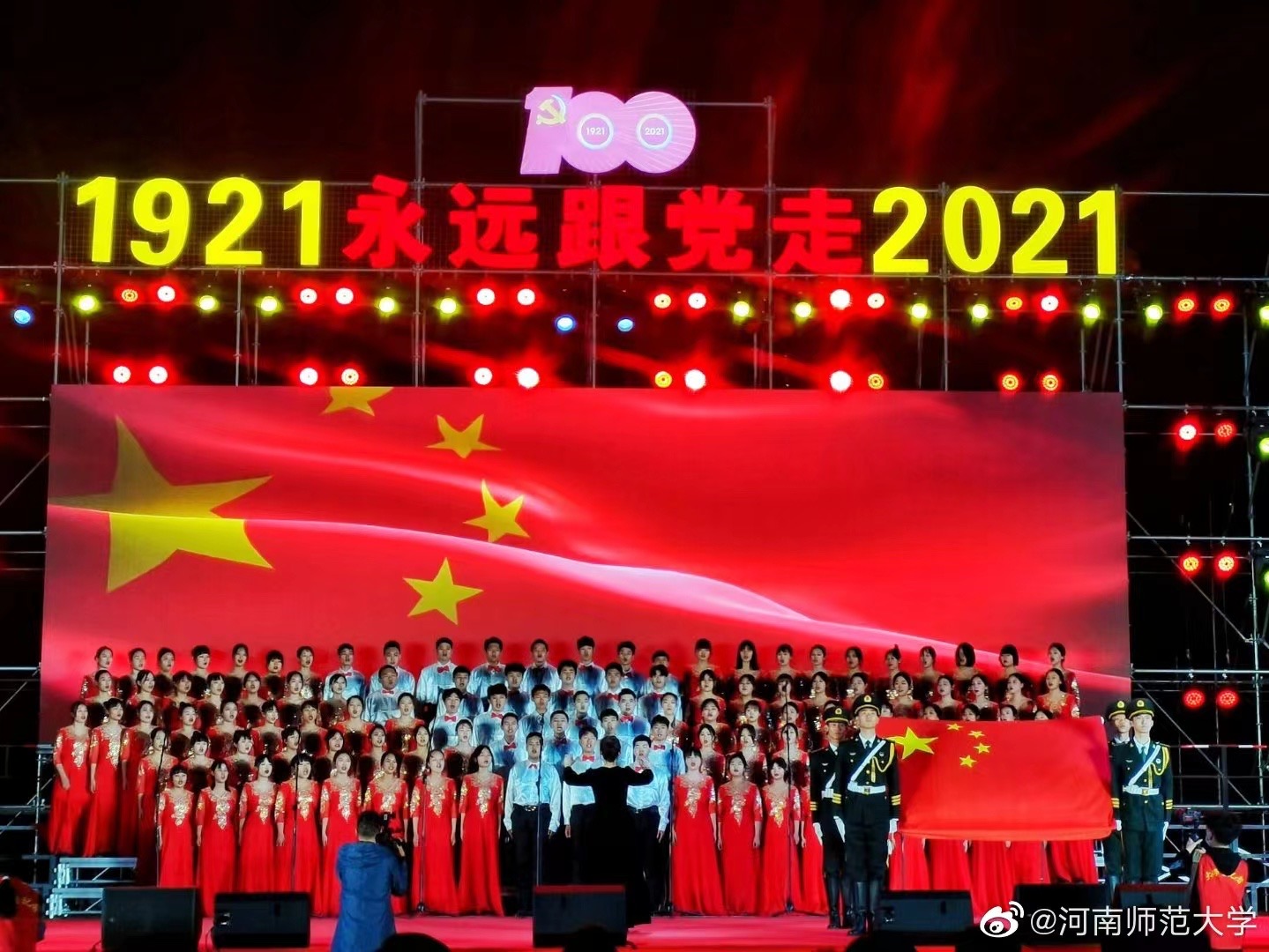 筹备之初,学院上下高度重视,精心从全体学生中挑选队员,发扬吃苦耐劳的精神,在课余时间认真排练。今年,我院抽中的参赛曲目是全场第二篇章“开天辟地”中的第一首《歌唱祖国》,这是一首广为人知,传唱度极高的歌曲,一提到这首歌,大家脑海中立马就会浮现2008年北京奥运会时林妙可的童声演唱。所以,我们特别邀请了师大附小小朋友领唱,稚嫩的童声赢得了现场观众的阵阵好评。同时,我们还邀请到校国旗护卫队的四位队员现场助演,庄严的五星红旗、铿锵有力的步伐,为我们的表演增添了视觉上的冲击力。赛场上,同学们激情昂扬、代入感极强的歌声,既唱出了大家身为新时代新青年的非凡自信,又唱出了举国上下、长城内外亿万中华儿女对党的感恩,对祖国母亲的拳拳爱意,当嘹亮的歌声响彻校园,观众在激昂的歌声中一同回首党的光辉历程,憧憬未来美好明天。