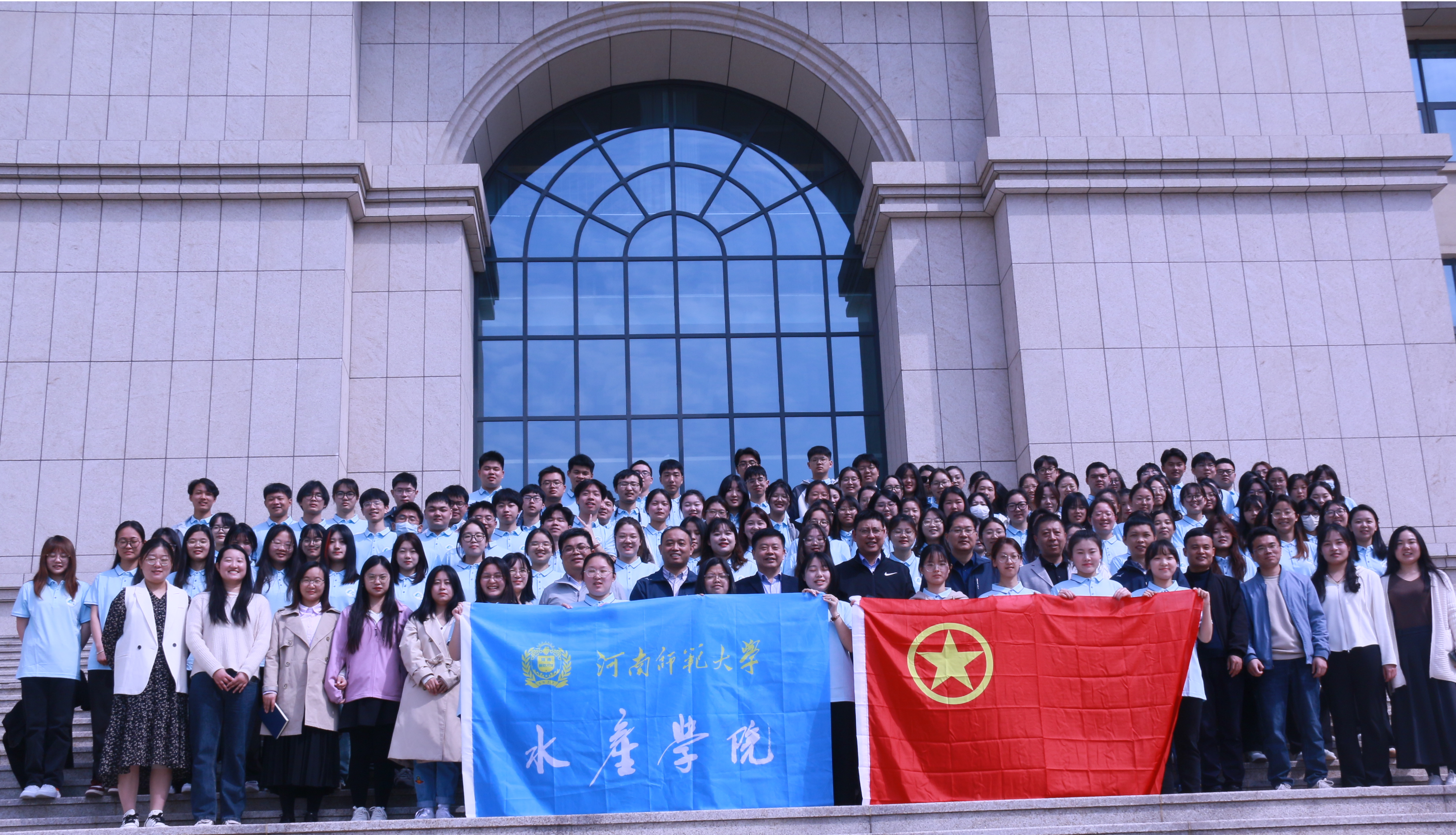 实习队员代表王一同学和指导教师代表赵燕静老师依次上台发言,表示一定严格遵守实习安排与纪律,保证圆满完成实习任务。会议最后,与会领导为各实习队授予院旗,向各流动团支部授予团旗并合影留念,象征着实习活动的正式启动。