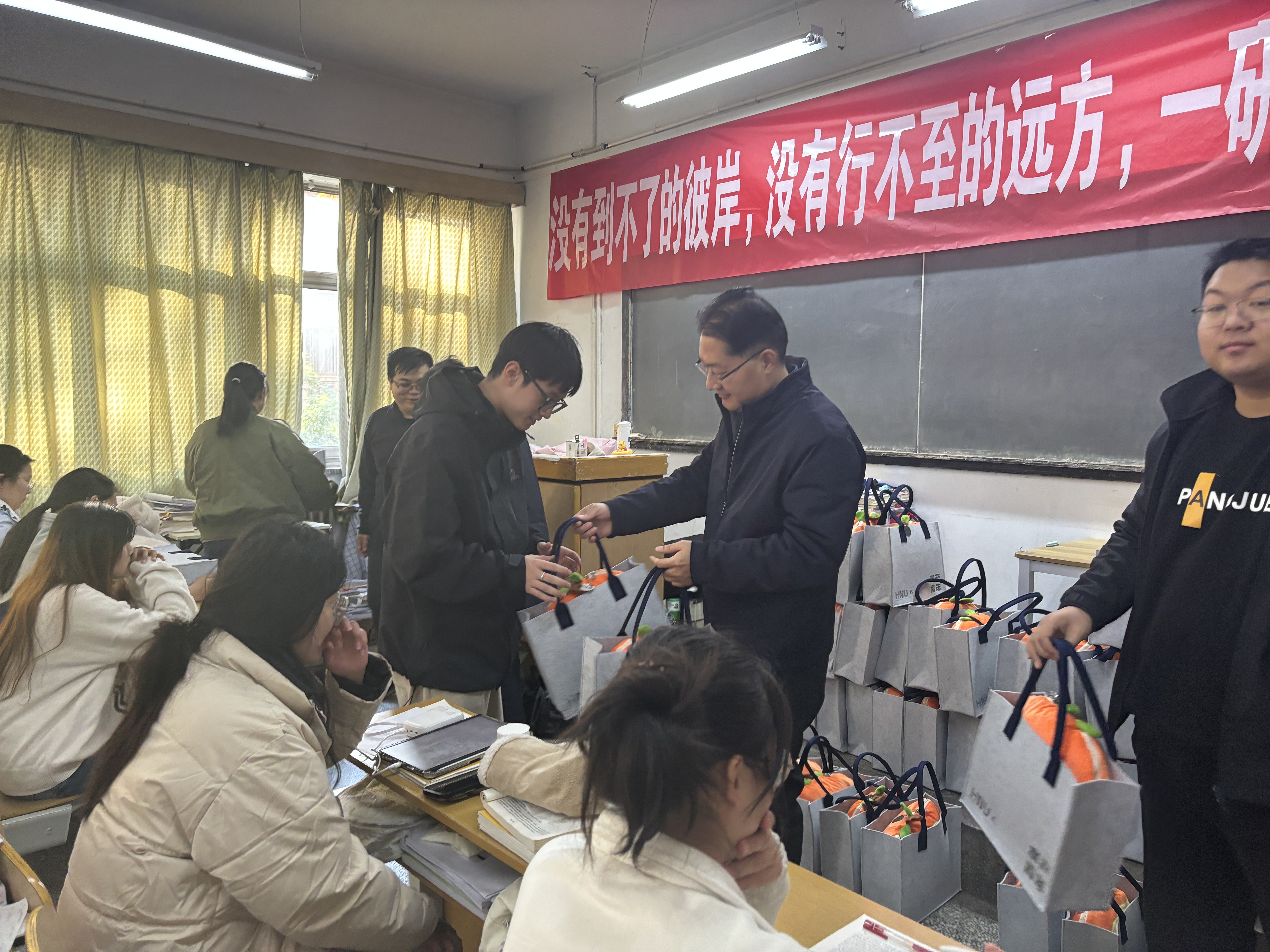 慰问现场,院党委书记李保华和院长孔祥会分别勉励大家要坚定信念,勇往直前;科学规划,合理安排;保持健康,调整心态;鼓励同学们在最后的冲刺阶段保持良好心态,合理安排时间,积极应对考试。随后,与会领导老师为考研学子送上暖心礼包,鼓励同学们坚定考研信念,轻松上阵、成功上岸。暖心礼包由橙子形状抱枕和定制的个人铭牌组成,寓意着考研学子们能够“心想事橙”、“橙”功上岸,在考研的战场上斩获佳绩,也象征着学院是同学们坚实的后盾,源源不断地为大家输送“橙”意满满的关怀与助力。抱枕摊开后还可变为小毯子,在寒冷的冬季为同学们复习备考带来保暖。此外,每个抱枕上挂有带着院徽的定制铭牌,希望考研学子秉承“知鱼知水,树德树人”的院训,成为强农兴农的主力军。