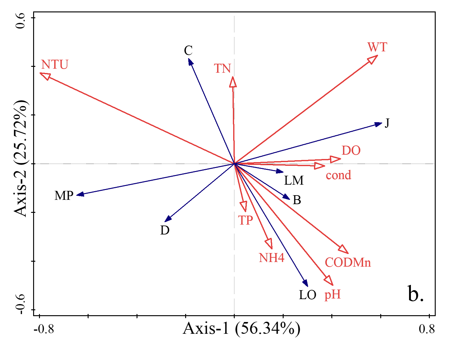 本次调查共鉴定27个浮游藻类功能群,即功能群ABCDEFGHJKLMLoMMPNPS1S2TTcW1W2X1X2X3XphY。此外,通过Anosim相关性分析表明,黄河流域河流和湖泊-水库河段的功能群组成存在显著差异(图1)。在河流流域,功能群MP组占主导地位,而功能群BJ在湖泊和水库中占优势。Mantel相关性检验和RDA分析表明,环境变量,如浊度(NTU)、水温(WT)、电导率(Cond)和总磷含量(TP),是影响黄河流域浮游藻类功能群分布格局的关键因子(图2)。同时,基于VPA分析的Venn图表明,湖泊水库区域的浮游藻类功能群主要受水体WTTP影响,而河流流域的藻类功能群组成更多的受地理气候变量的影响(图3)。本研究从流域角度解析了黄河流域流动河流和湖库断面浮游藻类功能群组成分布的关键驱动因子,有助于进一步研究河流生态系统中的浮游藻类组成,对河流生态系统的保护和管理具有重要意义。