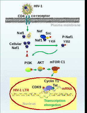 模式图: Nef通过招募Src激酶磷酸化Naf1促进HIV前病毒DNA转录。细胞内和病毒粒子释放的Naf1抑制PI3K/AKT/mTORC1通路。然而,HIV Nef招募Src激酶导致Naf1 552位点酪氨酸的磷酸化,使Naf1的“抑制”作用转换为“激活”功能。磷酸化的Naf1通过激活PI3K/AKT/mTORC1细胞信号通路,将转录因子P-TEFb(CDK9和Cyclin T1的复合物)募集到LTR区域以驱动前病毒DNA转录。