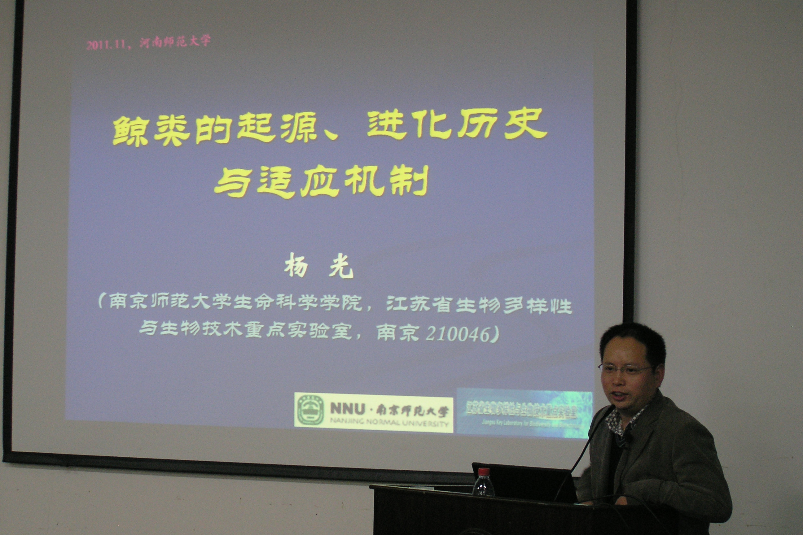 11月16日下午,生命科学学院邀请动物学国家重点学科带头人、南京师范大学特聘教授杨光在生物西楼二楼会议室为100余名研究生、本科生作了一场题为“鲸类的起源、进化历史与适应机制”的学术报告,学院相关领导、老师出席了本次报告会。报告会由聂国兴副院长主持。