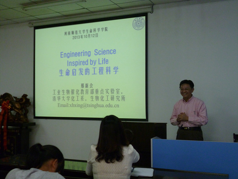 10月12日下午,清华大学化工系生物化工研究所所长、化工系副主任邢新会教授应邀来我校讲学。邢教授在生物西楼206会议室作了一场主题为“生命启发的工程学”的学术报告。生命科学学院相关领导、教师代表、研究生、本科生等100余人共同聆听了此次报告会。报告会由生命科学学院副院长李景原主持。