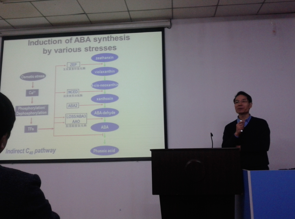 范六民教授针对植物逆境反应的分子机制及赤霉素信号在其中的作用机制、赤霉素信号与染色质重塑在植物发育中的作用、赤霉素信号与光及脱落酸信号的交互作用、植物逆境响应信号转导机制研究等问题进行了详细讲解。范教授对国家级生命科学实验教学示范中心进行了现场考察,并对学院发展提出了许多宝贵意见。