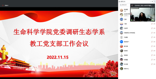 为考察基层思想工作动态,进一步学习贯彻党的二十大精神,引领各支部围绕“高质量党建促进事业高质量发展”这一主题,深化交流、凝聚共识。2022年11月15—18日下午,生命科学学院党委线上调研教工生态学系党支部、食品质量与安全系党支部的党建与事业发展情况,党委委员、相关支部全体党员参加会议。