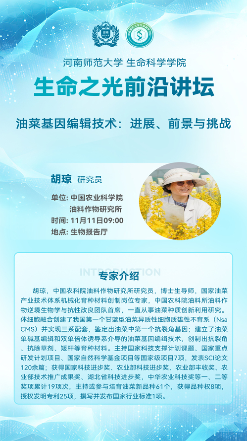 中国农业科学院油料作物研究所胡琼研究员将应邀来我校讲学