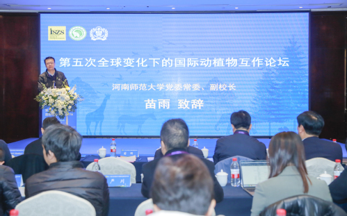 苗雨致辞,他向与会嘉宾介绍了我校的悠久历史和辉煌成就,尤其是在生物学科领域的卓越发展。他表示,作为学校最早创建的学科之一,生命科学学院如今已发展为涵盖本科、硕士、博士及博士后完整培养体系的高水平学科,拥有多项国家级、省部级科研平台及一流专业建设成果。本次会议是学校生物学科发展的重要里程碑,也是助力学科提质增效的一次盛会,为全球气候变化背景下的动植物互作研究提供了开放的交流平台。