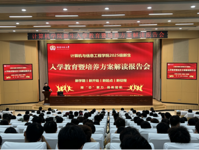 为帮助2025级新生深入了解计算机学科前沿动态,建立专业认知框架,明确学习发展方向,9月28日晚,计算机与信息工程学院成功开展以“计算之美,科学之魅”为主题的新生入学教育暨计算机科学前沿探索与新生启航教育。本次讲座主会场设在求真楼五楼西报告厅,分会场设在五楼东报告厅。院长袁培燕教授担任主讲,会议由院团委副书记魏继拓主持,2025级专兼职辅导员和全体新生共同参会。
