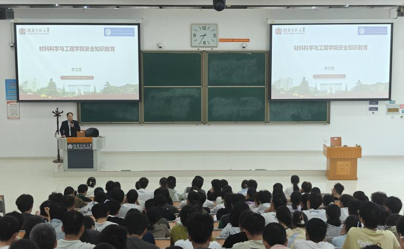 讲座伊始,李文胜结合高校真实案例,深入剖析了当前校园安全面临的复杂形势,强调安全是学生成长成才的根本前提,要求全体新生必须牢固树立“安全第一,生命至上”的理念,将安全意识内化于心、外化于行,尽快适应大学环境,开启安全、健康、充实的大学生活。他围绕“筑牢校园安全防线”这一主题,从国家安全、消防安全、人身安全、求职安全、财产安全、实验室安全等方面进行了系统讲解,并重点结合材料学科专业特点,详细阐释了实验室操作规程、化学品存放与使用规范、电气设备安全注意事项等内容,同时通过真实发生的安全事故案例,警示同学们严格遵守实验纪律,杜绝安全隐患。