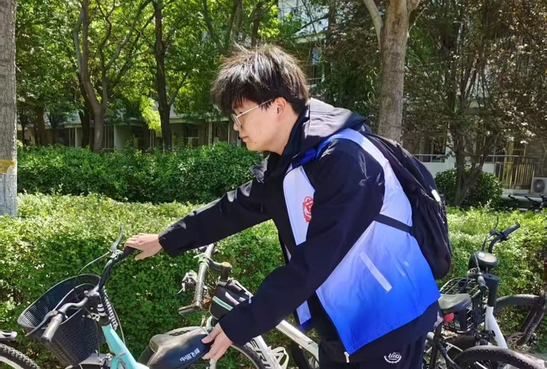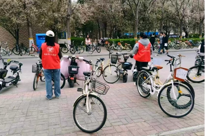 随后,老师们的带领下,志愿者们在西寓十号楼前摆放车辆,捡拾垃圾,大家分工协作、结对而行,整齐有序的车辆和志愿者笔挺的身姿形成了校园一道靓丽的风景线。