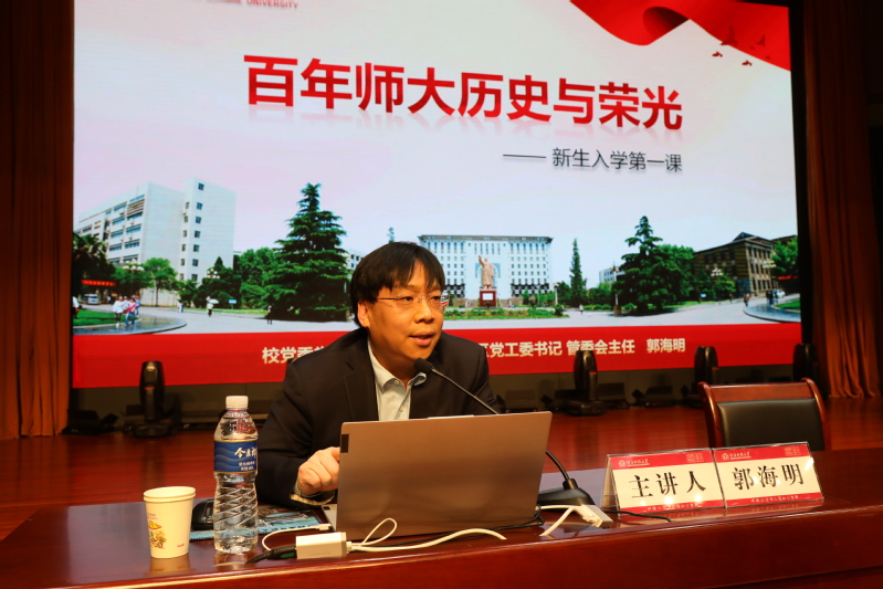 课堂上,郭海明以“百年师大历史与荣光”为题,围绕“百年师大,风华正茂”、“人才济济,心系国家”、“科学研究,硕果累累”、“社会服务,成效显著”、“寄语青年,逐梦起航”五个方面展开,总结了师大在人才培养、科学研究、教育教学、社会服务等方面结出的累累硕果。他寄语广大新生:一要立大志,立志求真学问,增强学习的紧迫感、主动性,不断提高与时代发展和事业要求相适应的素质和能力;二要有大爱,把社会需要放心上,与社会发展同心同向,成为走在时代前列的奋进者、开拓者、奉献者;三要担大任,要敢于迎难而上,勇于担当,要不断适应新环境、迎接新挑战,以青春之活力创造国家科技创新的春天。