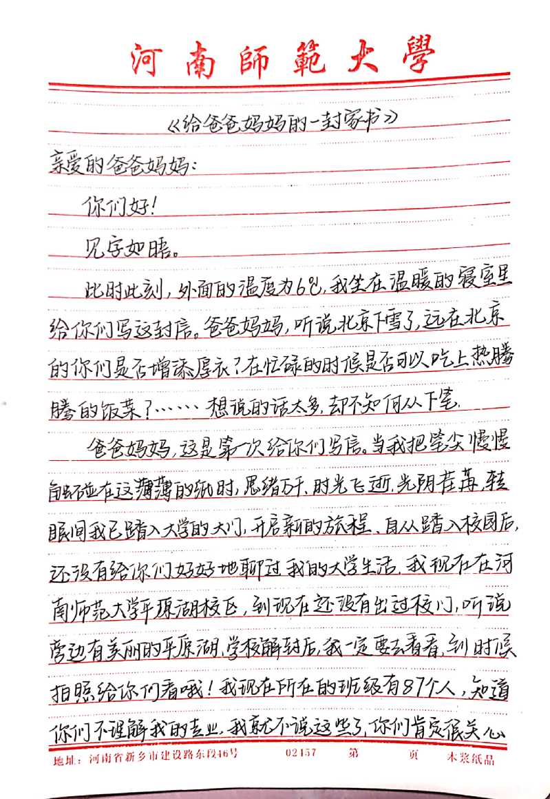 予一纸家书信,载一片游子情。“10月11日与您分别以来,已经三十余天。一个人在外面生活才发现真不容易,我敢保证下次您来我房间收脏衣服,我绝对不嫌你烦,麻溜地就自己洗了……”“今年我们没有军训,第一次接触大学里的老师和课程,跟以前很不一样,很多事要靠自己摸索,但我会多向老师和学长请教,慢慢调整自己的。接下来我也会好好照顾自己,不会再让您费心了……”类似的话在每位新生的家书上都能够找到,他们仿佛一夜之间长大,对自己的思考、对父母的感恩、对未来的期待跃然纸上。相信在收到这份意外来信后,父母的欣慰之情一定会溢于言表。