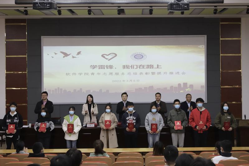 为弘扬雷锋精神,加强精神文明建设,提升志愿服务育人实效,3月5日上午,软件学院在学院217报告厅举办“学雷锋,我们在路上”青年志愿服务总结表彰暨提升推进会。校党委宣传部、校团委、软件学院相关负责人以及70余名青年志愿者代表参加,活动面向平原湖校区进行在线直播,线上线下观看人数500余人,表彰会由软件学院党总支副书记苗山根主持。