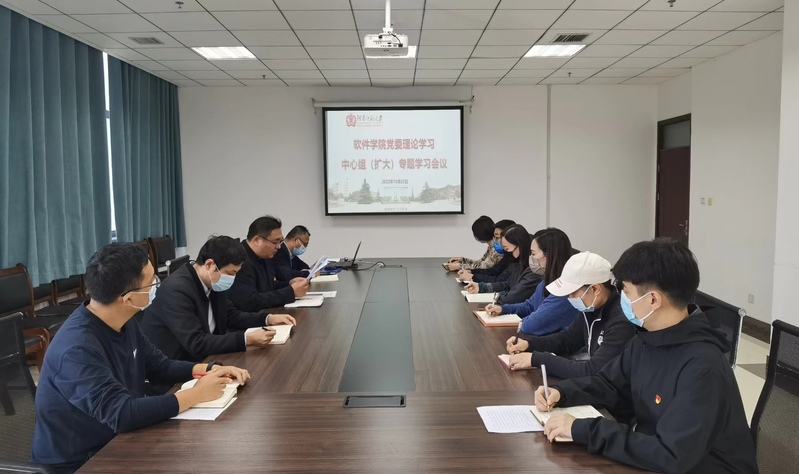 10月25日下午,软件学院党委在平原湖校区图书信息楼六楼会议室召开理论学习中心组(扩大)会议,专题学习党的二十大精神,学院全体教职工以线上线下相结合的方式参加了学习,会议由学院党委书记马新峰主持。
