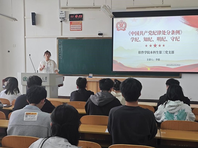 4月29日上午,软件学院本科生第十党支部在平原湖校区向学楼204教室召开党纪学习教育支部集中学习会,认真学习领会、贯彻落实新修订的《中国共产党纪律处分条例》,切实推动支部党员同志不断学纪、知纪、明纪、守纪。
