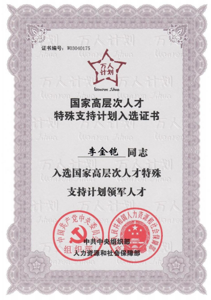2017年度“万人计划”国家高层次人才特殊支持计划入选证书 ~ 李金铠