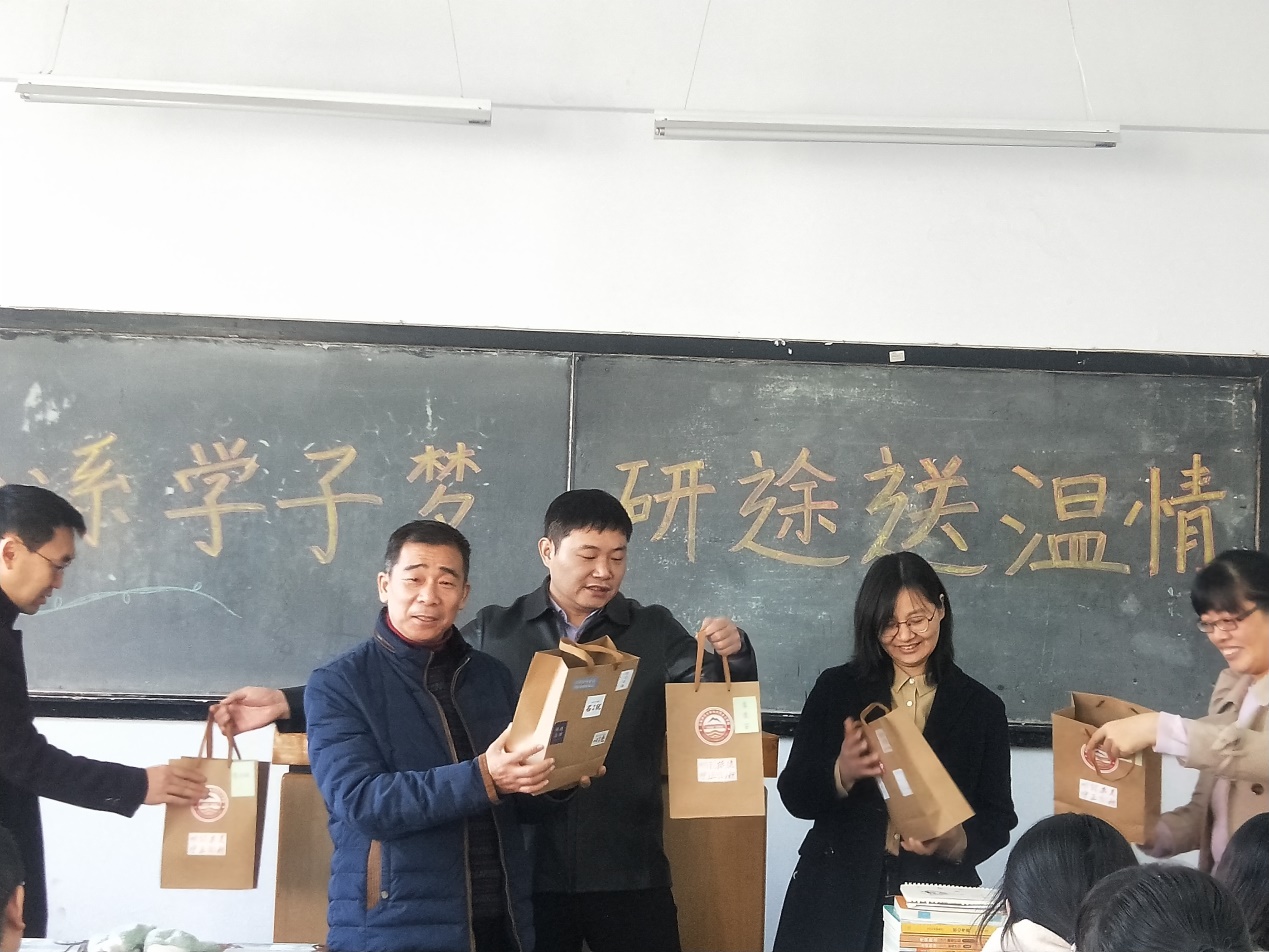 院党委书记马二杰对于考研学生积极准备、勤奋复习的状态给予了赞扬和肯定,鼓励学生们保持良好的心态,坚定信心,从容地迎接考试,并表示学院会尽力帮助解决同学们在学习、生活和心理上的各种难题,为考研学子做好服务。院长蒋占峰真切地询问了学生们的备考状况,并就考前准备和应试技巧为学生们提出了建议和指导,希望考研学子考前做到劳逸结合,注意身体健康,高效安排复习计划,在考场上尽量保持字迹工整,结合时事政治,丰富答题内容。最后,学院领导老师为考研学子送上精心准备的礼物和学院老师亲手为每一位学生写的专属考研祝福明信片,老师们真挚的话语为考研学子紧张的备考学习带来无限温暖和动力。