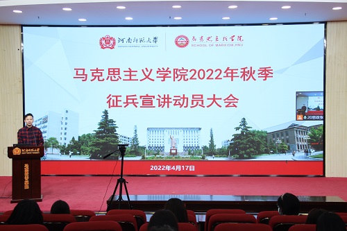 青春风华正茂,参军无上光荣。为鼓励大学生积极应征入伍,4月17日晚,马克思主义学院于求是东楼召开2022年秋季征兵宣讲动员大会,会议采取线上与线下相结合的方式进行。优秀退伍学生石聃、吴晨亮、张清华、景亚璐进行宣讲。学院各年级辅导员、全体学生参会。会议由辅导员郭豪栋主持。