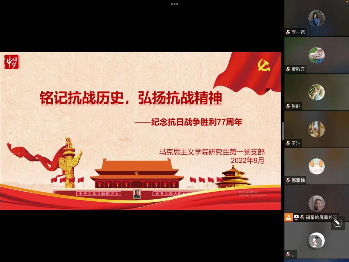2022年9月3日是中国人民抗日战争暨世界反法西斯战争胜利77周年纪念日。为进一步铭记抗战历史,汲取奋进力量,马克思主义学院研究生第一党支部于9月27日下午在线上召开“铭记抗战历史,弘扬抗战精神”主题党日活动,支部全体党员参与其中。