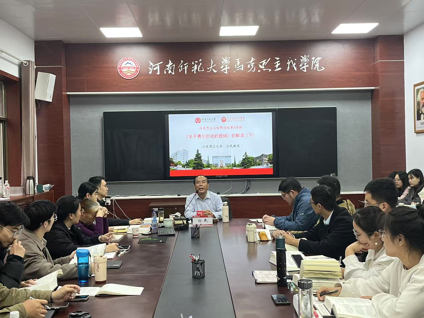 1118下午,山东理工大学马克思主义学院孙民教授应邀为马克思主义学院师生作题为“《关于费尔巴哈的提纲》的解读”()的学术讲座。这也是河南师范大学马克思主义学院牧野论坛第115期()。讲座在平原楼201举行。马克思主义学院教师代表和全体硕博研究生参加了此次讲座,此次讲座由马克思主义学副院长余保刚教授主持。