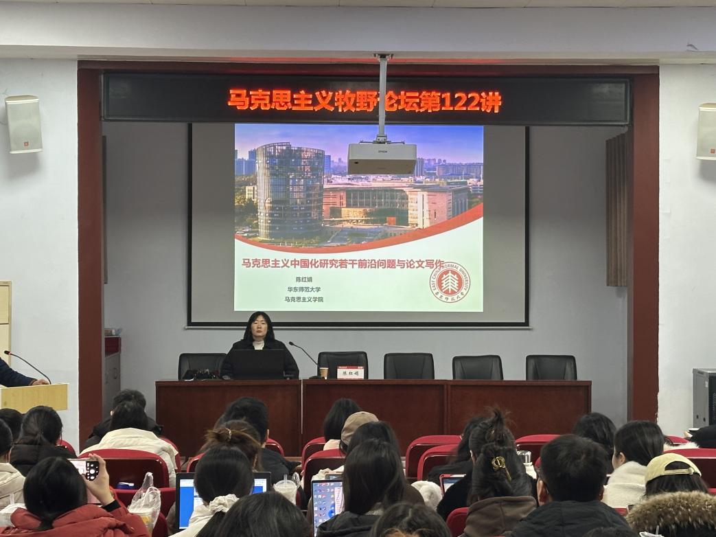 1月5日,华东师范大学陈红娟教授应邀为马克思主义学院师生作主题为“马克思主义中国化研究若干前沿问题与论文写作”的学术讲座。这是河南师范大学马克思主义学院牧野论坛第122期,讲座在平原楼108举行。本次讲座由马克思主义学院院长蒋占峰教授主持,马克思主义学院教师代表及硕博研究生参加了此次讲座。