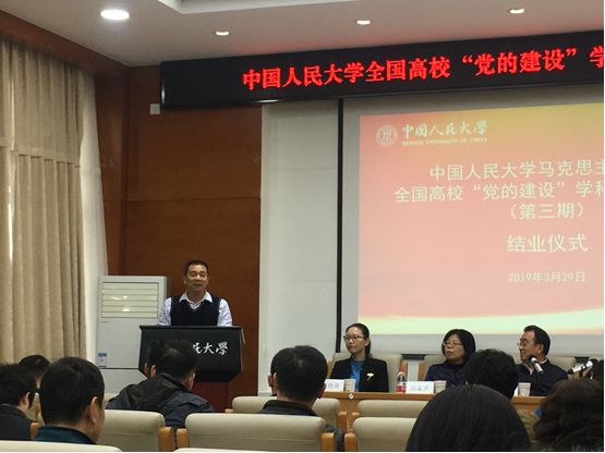 3月29日,由中国人民大学马克思主义学院举办的第三期全国高校“党的建设”学科师资培训班举行结业仪式,包括我院蒋占峰教授在内的来自全国44所高校的46位教师完成了学习任务,顺利结业。