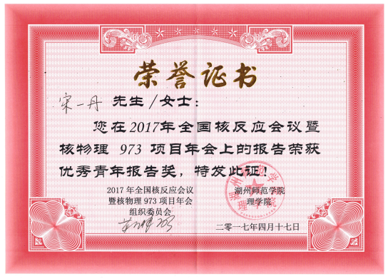 近日,在2017年全国核反应会议暨核物理973项目年会(4月14-28日)上,我校物理与材料科学学院2013级物理学本硕生宋一丹同学荣获优秀青年报告奖。