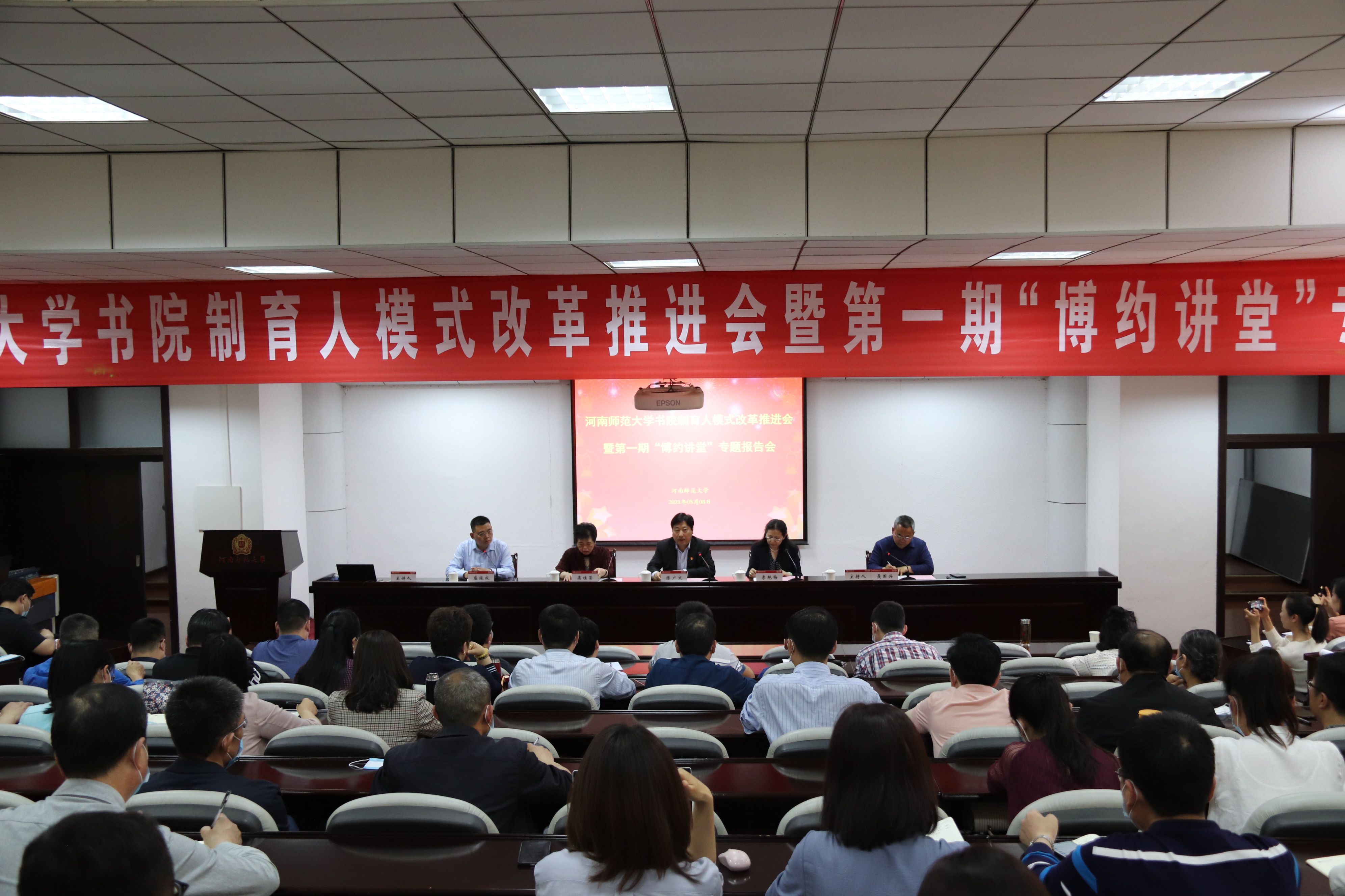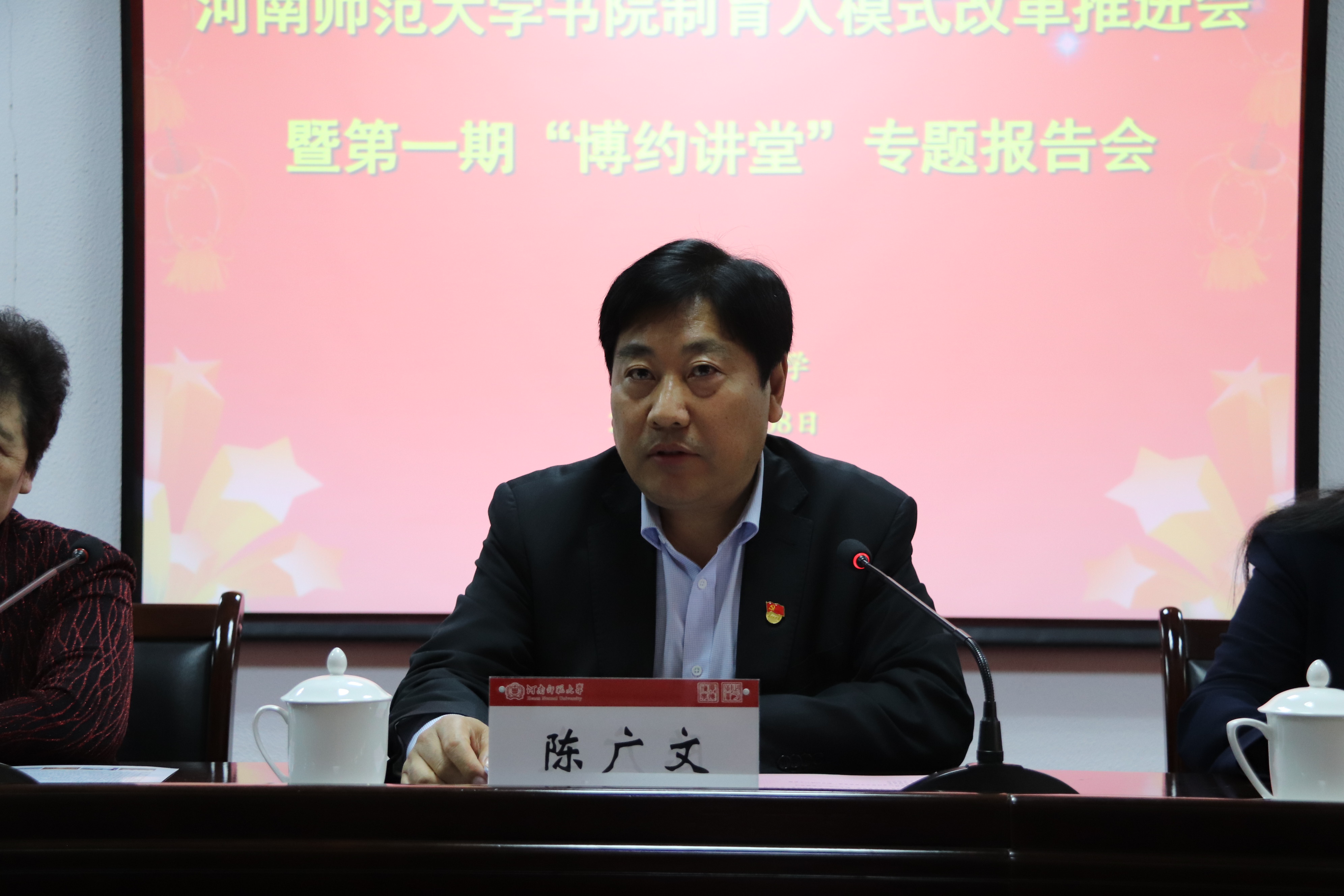会议第一阶段由教务处处长聂国兴教授主持。陈广文书记发表讲话,陈广文指出,书院制育人模式是经过历史检验、国内外著名高校实践验证行之有效的创新育人模式,具有强大的育人优势、强劲的发展生命力和广阔的发展空间。“博约讲堂”是我校创新人才培养模式,提高人才培养质量的重要交流平台,也是书院制育人模式改革的有机组成部分。我们必须始终牢记“为党育人、为国育才”的初心使命,大力推进书院制育人模式改革。教务处副处长崔振成教授传达了“河南省高等学校书院制育人模式改革现场交流会”精神,并阐释了河南师范大学“博约讲堂”成立目的、文化渊源和运行规划等情况。