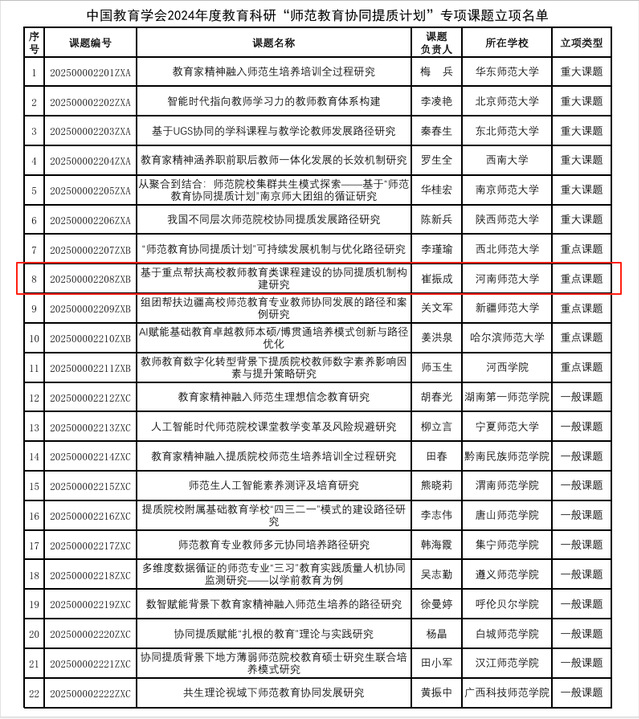 近日,中国教育学会公布了2024年度教育科研“师范教育协同提质计划”专项课题立项名单,共立项专项课题22项,其中重大课题6项、重点课题5项、一般课题11项。我校崔振成教授申报的《基于重点帮扶高校教师教育类课程建设的协同提质机制构建研究》获批重点课题立项,资助经费为20万元,是本年度教育部师范教育协同提质计划华南师范大学组团高校唯一立项课题。